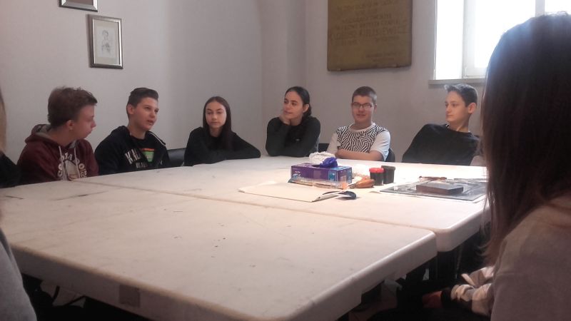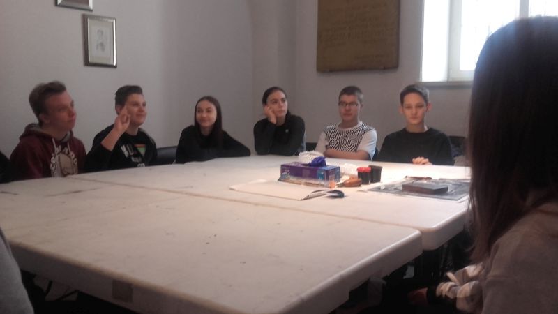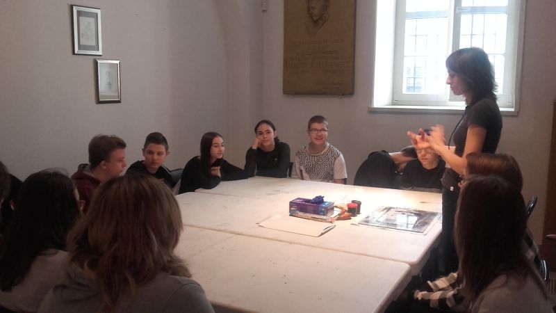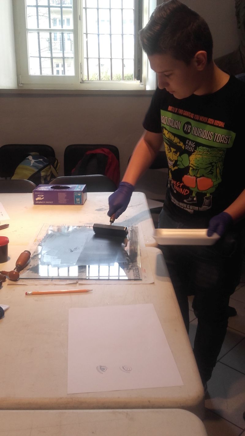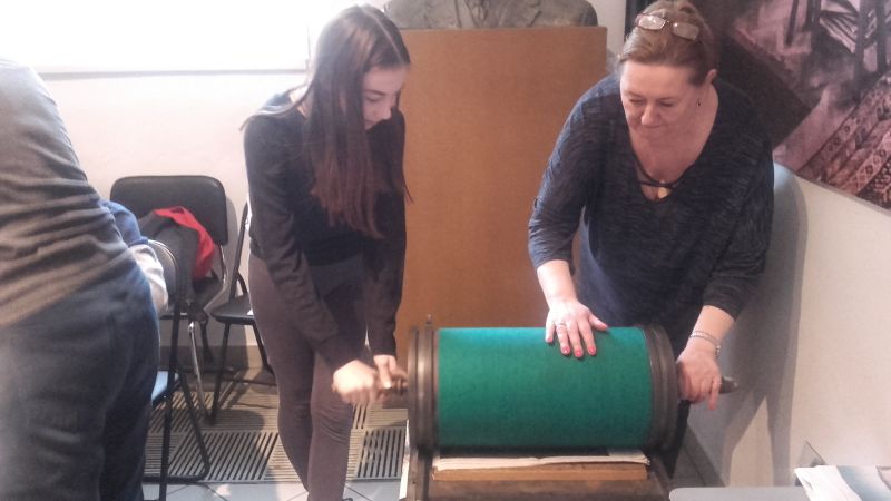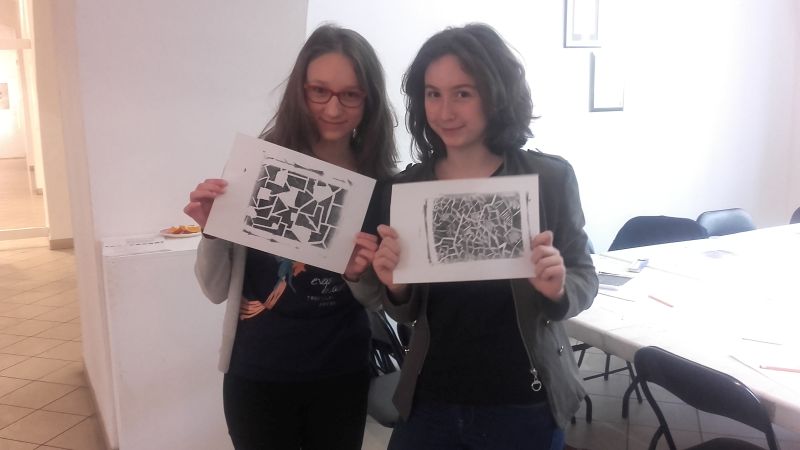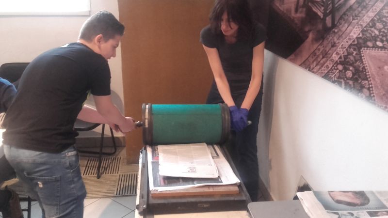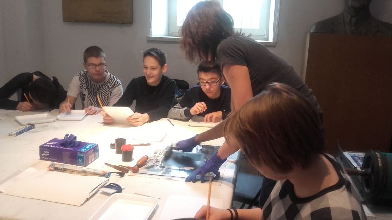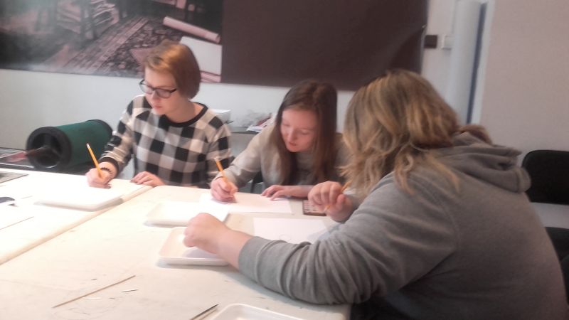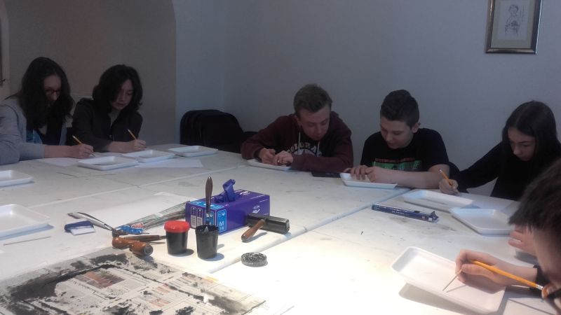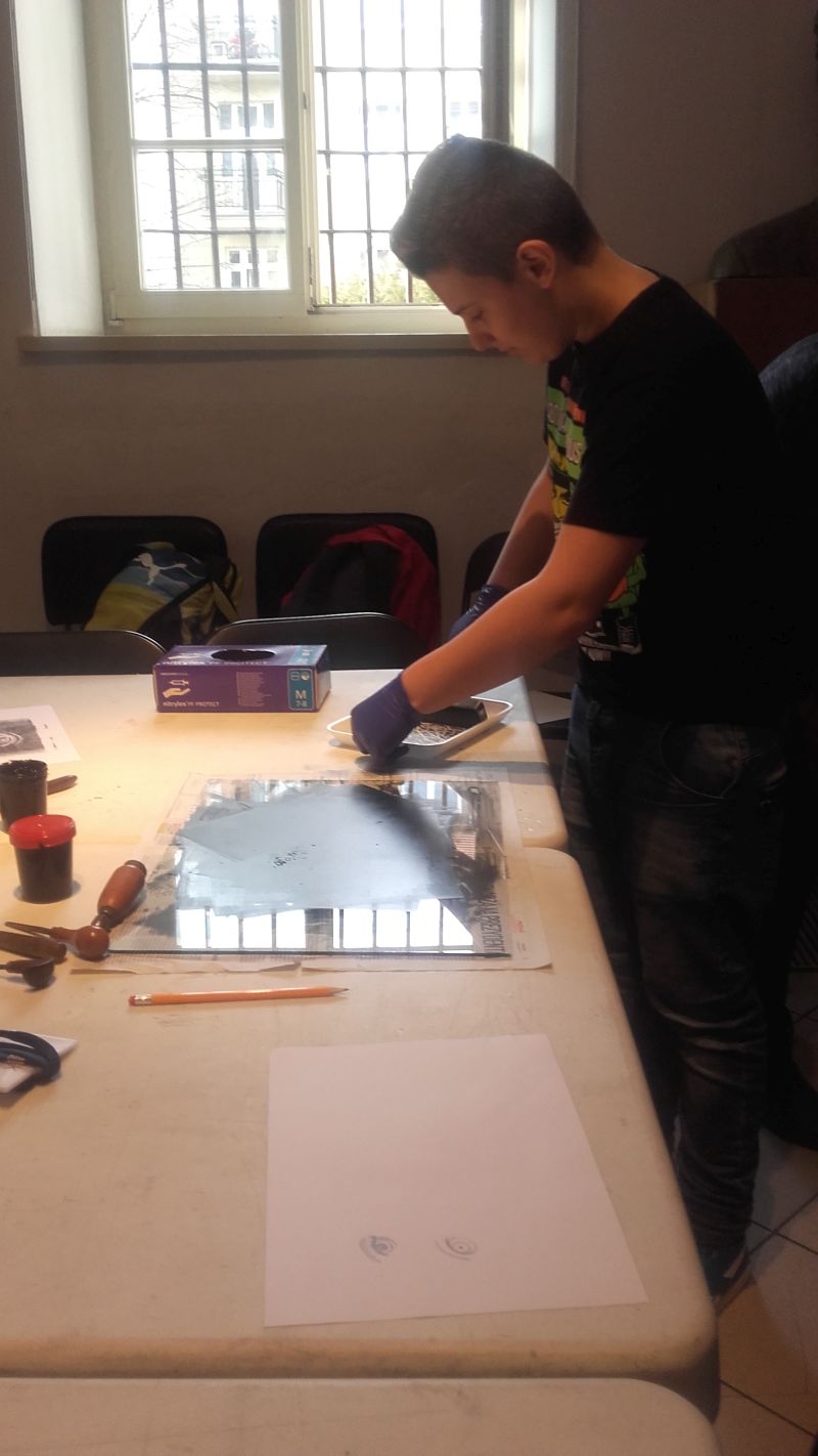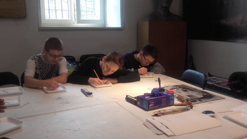 Gimnazjaliści poznali także zagadnienia druku, techniki graficzne oraz materiały i narzędzia graficzne, a następnie, wykorzystując zebrane podczas zajęć informacje, próbowali wcielić się w rolę artysty i samodzielnie odbijali grafiki na prasie.