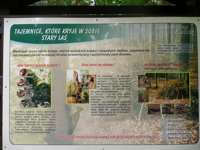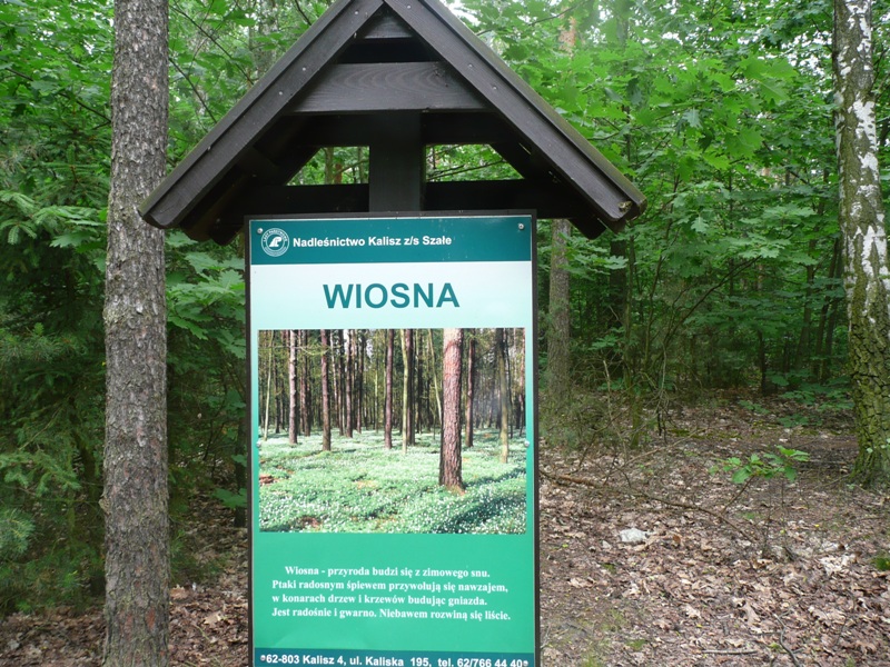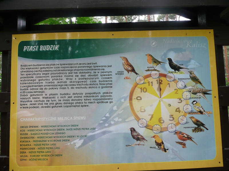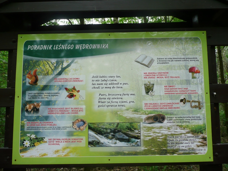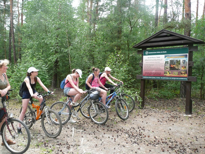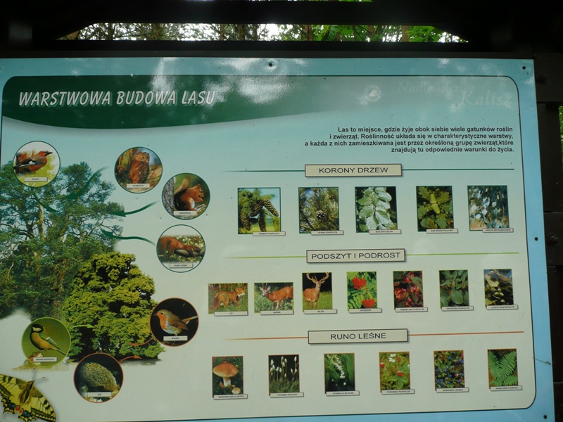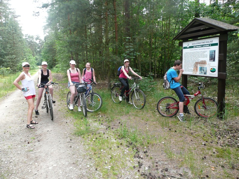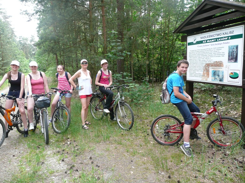 Jechaliśmy drogą nad Prosną skąpaną w promieniach czerwcowego słońca. Po drodze minęliśmy Aquapark, pole golfowe „Jantar”, Kaliskie Towarzystwo Kolarskie i w końcu ul. Wypoczynkową dotarliśmy na miejsce. Celem wyprawy było poznanie ścieżki przyrodniczo – leśnej „Winiary”, która ma długość ok. 3 km. Na jej trasie znajdują się 34 tablice, które przybliżają naukę o lesie, pokazują budowę i funkcjonowanie ekosystemów leśnych, a także tego, co im zagraża i je chroni. Ponadto informują, jaka jest rola leśników w gospodarowaniu zasobami przyrody. Dzięki tablicom wizualnym można się nauczyć rozpoznawać gatunki drzew iglastych, liściastych, zobaczyć – jak rośnie drzewo, policzyć ile ma lat. Można również nauczyć się rozpoznawać ptaki występujące w lesie. Ciekawa okazała się tablica „Ptasi budzik” pokazująca godziny aktywności ptaków śpiewających.