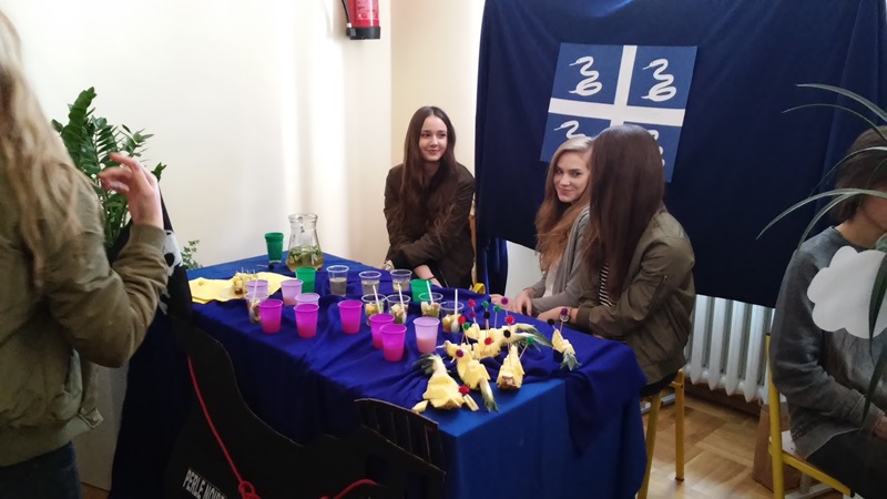 By przybliżyć nam francuskojęzyczne kraje, wyświetlono prezentacje na temat zwyczajów, wierzeń oraz ciekawostek dotyczących wybranych czterech państw frankofońskich: Haiti, Gwadalupy, Saint-Martin i Martyniki. Grupę z naszego gimnazjum zaproszono następnie na poczęstunek, podczas którego stoiska tematyczne, odwzorowujące poszczególne terytoria, rywalizowały między sobą, oferując przepyszne owoce, koktajle, wypieki i potrawy charakterystyczne dla państw frankofońskich. Zwycięska okazała się Guadelupa!